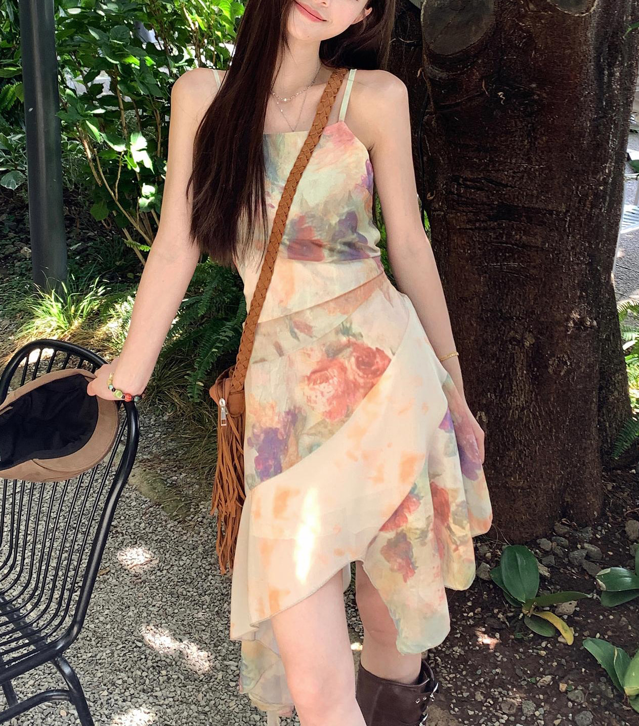[당일배송] 해외여행룩 언발란스 레트로 꽃 프린팅 빈티지 스퀘어 슬림핏 미니 원피스 공항룩/공항패션