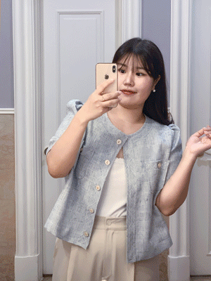 [55-100]빅사이즈 코제트 라운드 노카라 골드버튼 퍼프 반팔 트위드 자켓