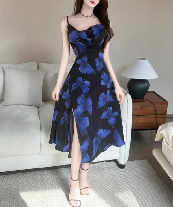 데이스 민소매 플라워 배색 러블리 A라인 트임 여름 바캉스 롱원피스