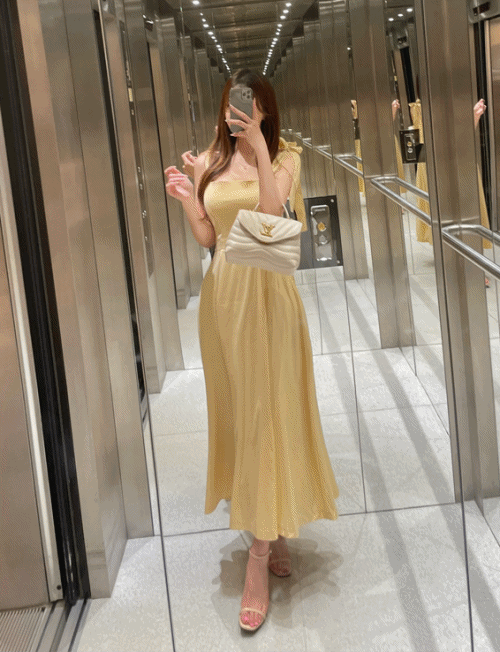 러블리리본 핀턱 플레어 스퀘어넥 롱원피스 바캉스룩 휴가룩 비치원피스 스냅원피스