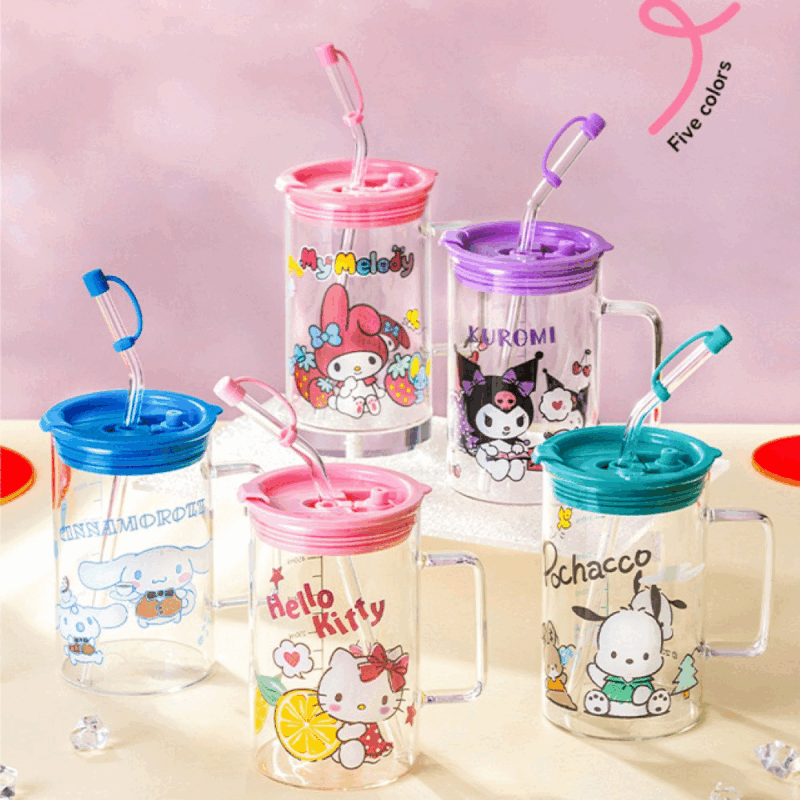 산리오 밀봉 뚜껑 빨대 투명 유리컵 700ml 대용량 실리콘 캡 먼지 방지 냉온 음료 겸용 고봉산 유리 소재 눈금 표시