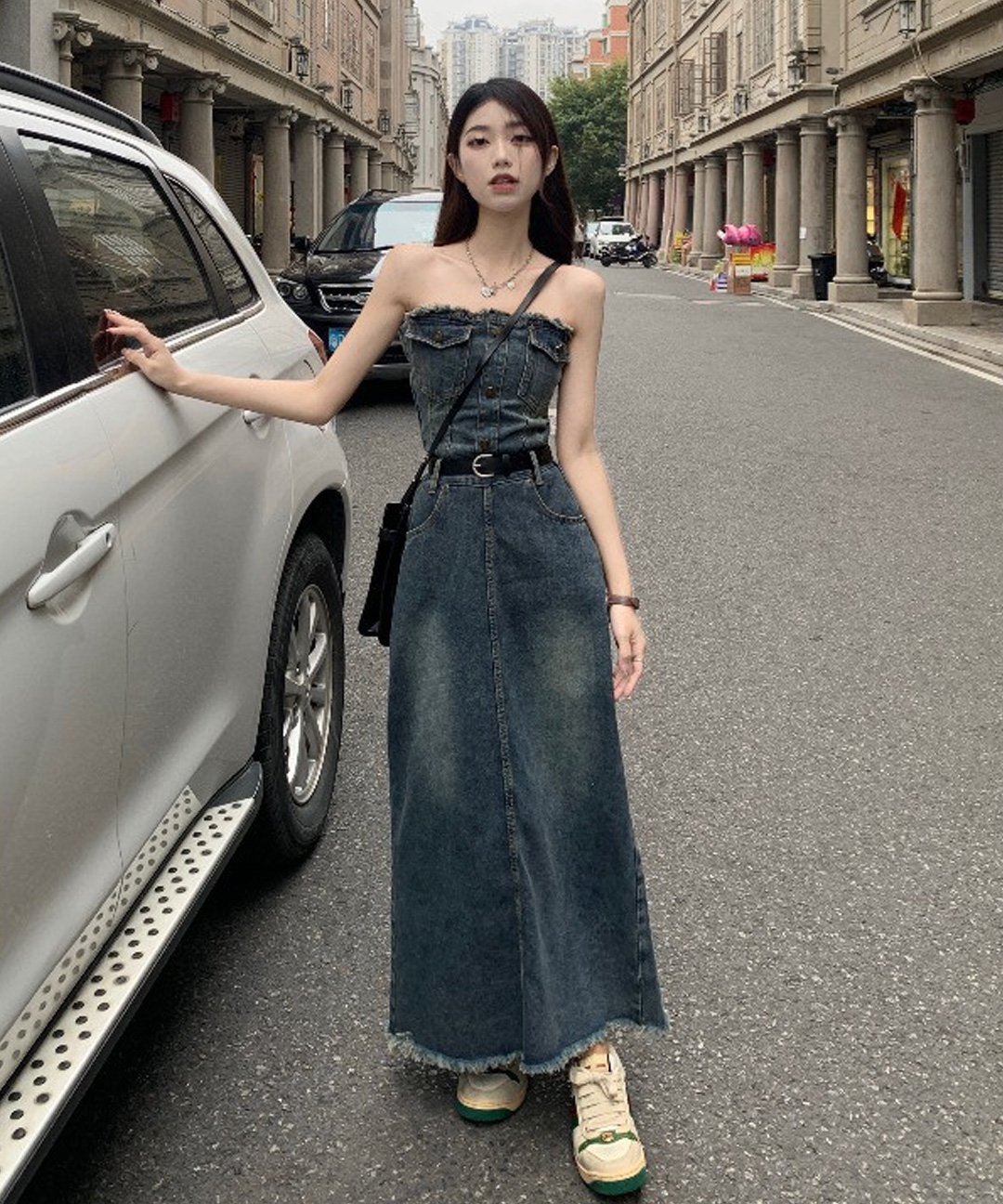 [S~2XL/무료배송]튜브탑원피스 데님롱원피스