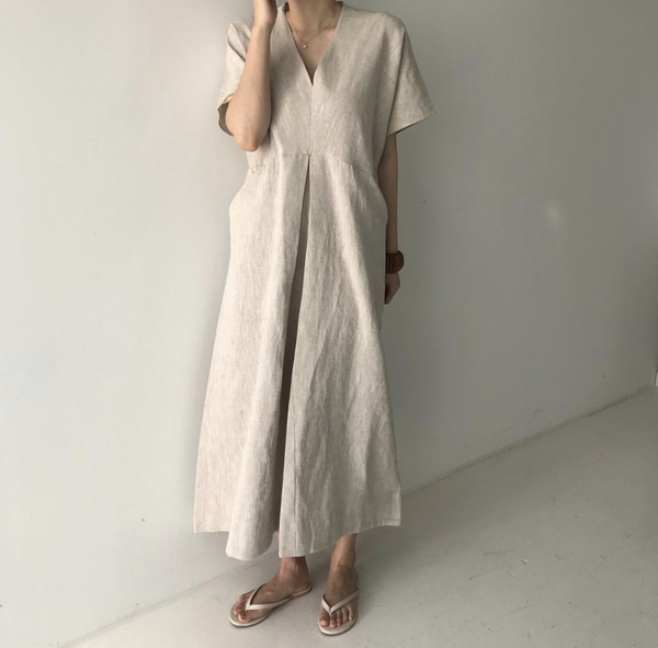 라첼 브이넥 핀턱 반팔 오버핏 포켓 여름 루즈핏 데일리 박시핏 맥시 린넨 롱 원피스
