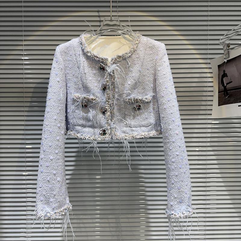 연 보라 퍼플 타로 큐빅 보석 깃털 장식 트위드 숏 자켓