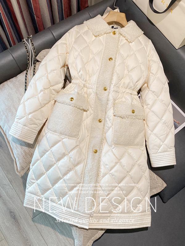 아이보리 트위드 스플라이싱 라펠 다운 패딩 점퍼 슬림 포켓 금장 코트