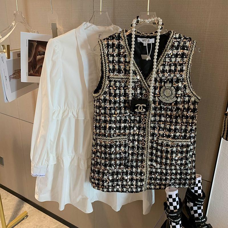 트위드 체크 조끼 베스트 스팽글 펄 금장 자켓 화이트 셔츠 투피스 세트