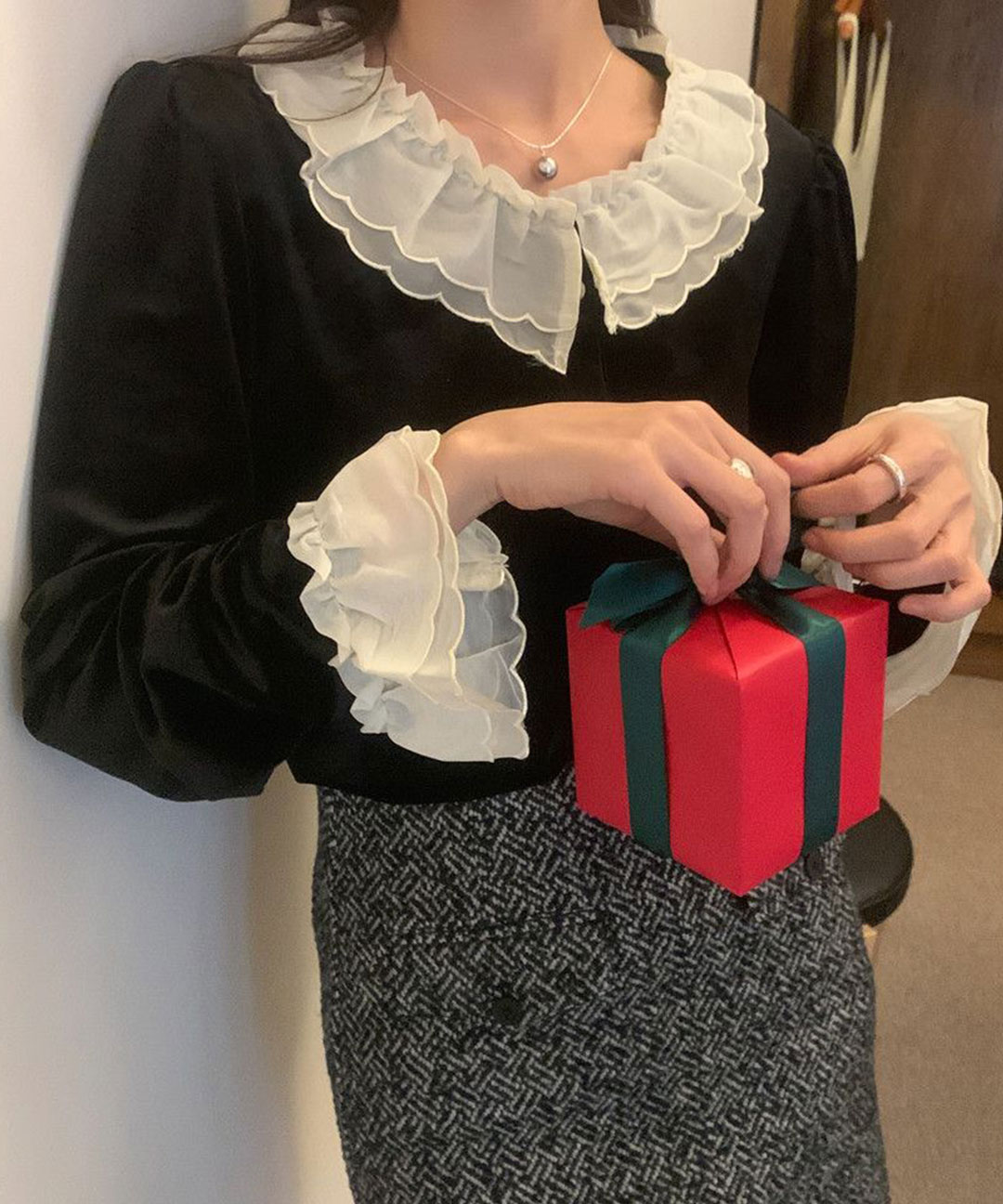 [위드미어바웃]프릴 벨벳 파티 블라우스