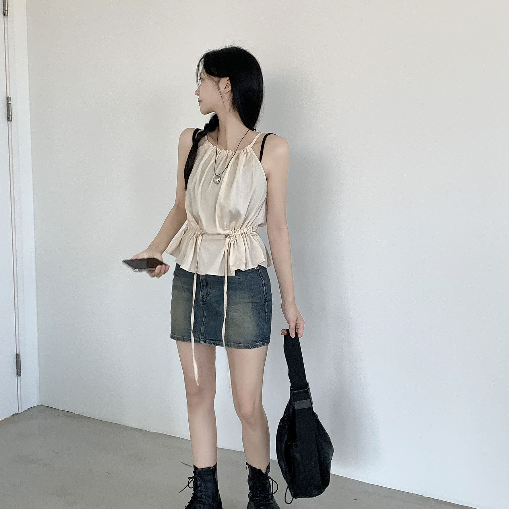 [핏보장!스트링조절가능]시원한 나일론 홀터 나시 블라우스 슬리브리스