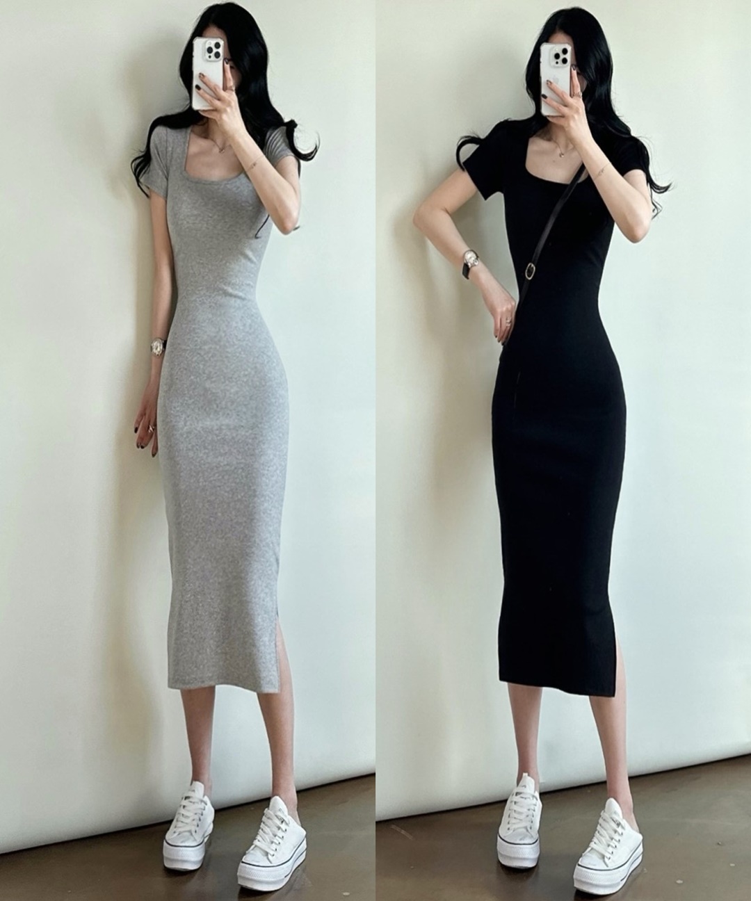 [착붙핏/글램룩]여름 원더 스퀘어넥 반팔 스판 양 옆트임 롱 원피스 밀착핏