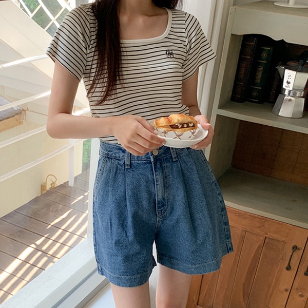 [여름/휴양지룩] 비에이 자수 단가라 반팔티셔츠 - 3 Color (썸머/여행룩/스트라이프/스퀘어넥)