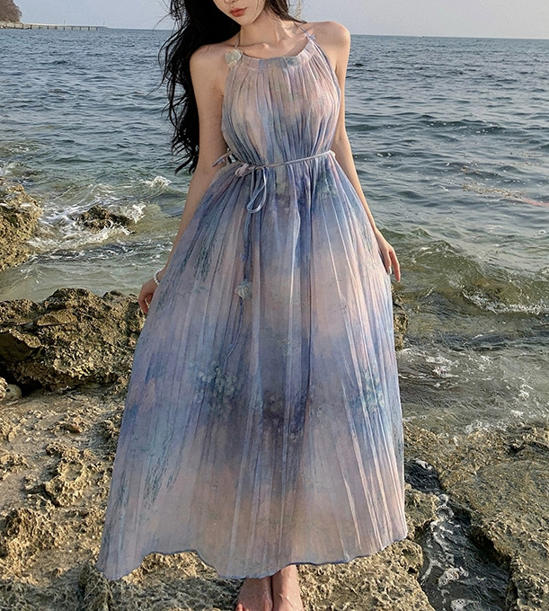 여신 블루 그라데이션 홀터넥 주름 비치 페미닌 뒷트임 맥시 원피스 해외여행/촬영룩/해변룩