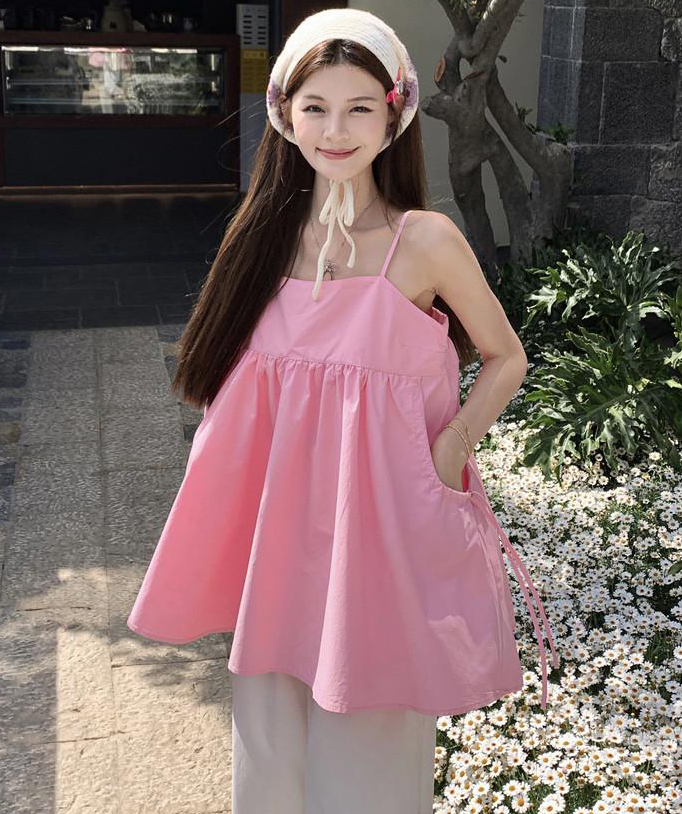 포켓 편한 루즈핏 핑크/블루 레이어드룩 뒷밴딩 플레어 끈 나시 블라우스 해외여행/공항/주말룩
