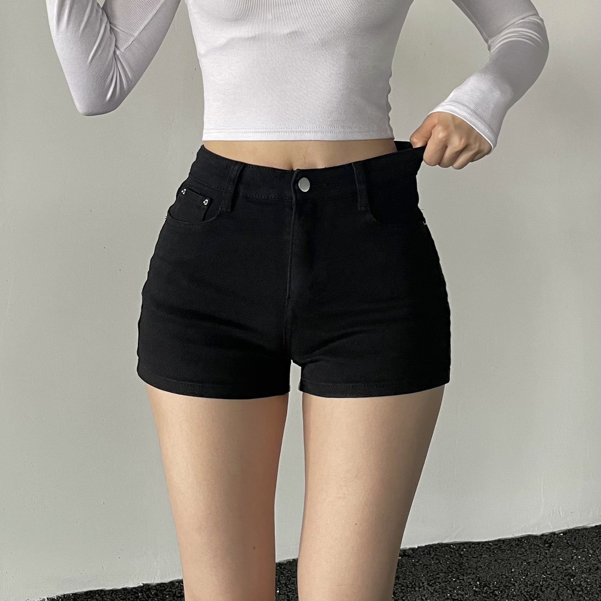 [여름 기본템] 하이웨스트 스판 블랙 숏팬츠 검정반바지 데님팬츠