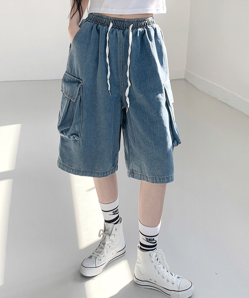 [청카고/4XL] 데님 와이드 카고반바지 허리밴딩 6부반바지 청반바지 버뮤다 남녀공용 빅사이즈까지
