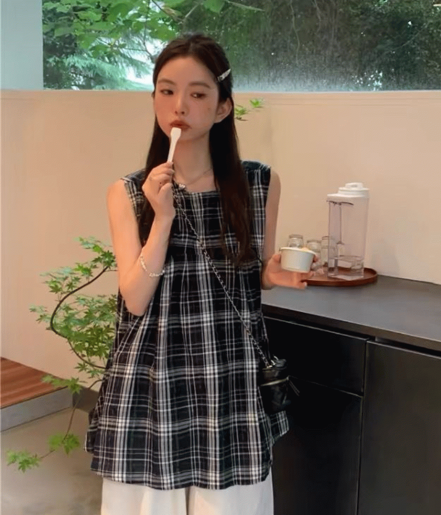 치브❤️체크 민소매 라운드 데일리 블라우스 1color