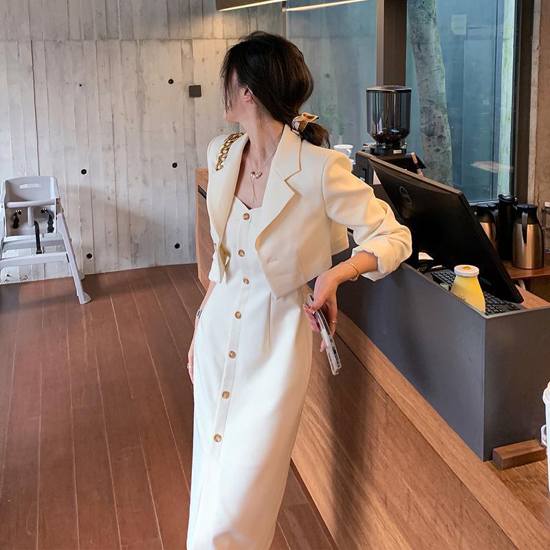 아이보리 정장 숏 자켓 롱 금장 원피스 투피스 수트 세트