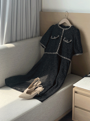 [55-120]빅사이즈 하객룩 루엣 트위드 라운드 배색 수술 포켓 A라인 미디 롱 원피스