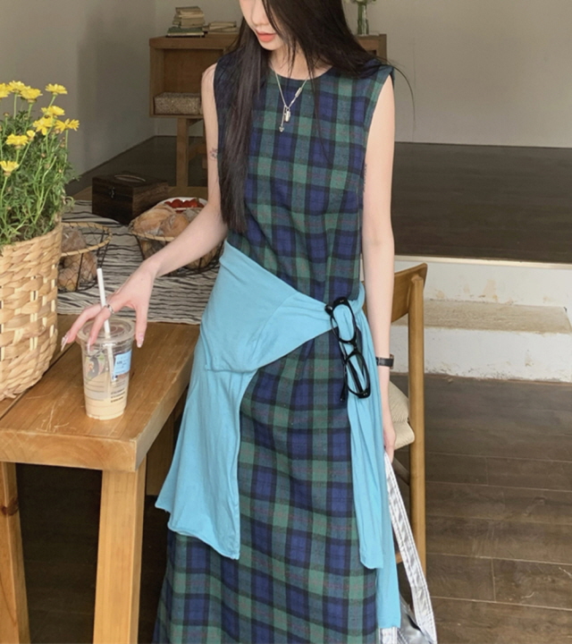 수입여성의류 명품스타일20대여성 체크 민소매 롱원피스