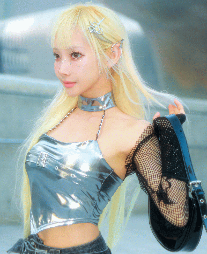 슈퍼노바 사이버펑크 쇠맛 실버 홀터넥 크롭탑 (흠뻑쇼상의,펑크,페스티벌룩,y2k,써지컬,메탈,아이돌룩,댄스의상,드코,드레스코드)