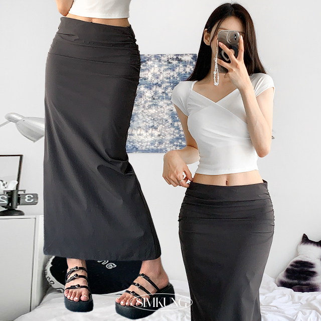 [모델극찬/강추/2col] 민니 슬림핏 로우 셔링 스판 맥시 롱 스커트