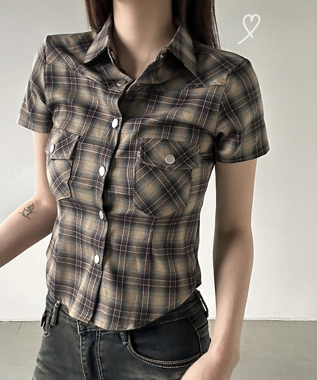 당출🚀3컬러🤍[2size] 체크 배색 포켓 똑딱이 반팔 셔츠 3color