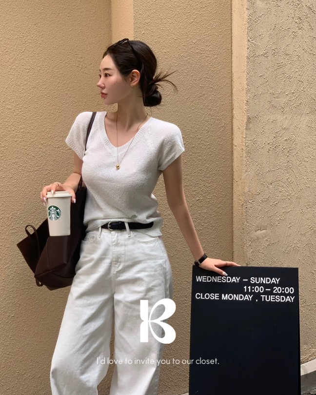 [당일출고][MADE/린넨원단]오브 캡소매 브이넥 린넨 반팔 니트