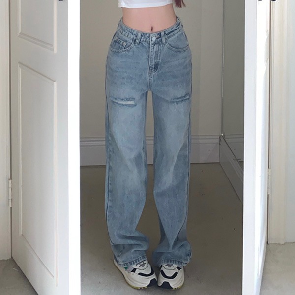 켄티 데미지 데님 팬츠 (S~L) (스트레이트핏-일자핏-하이웨스트-롱버전-찢청-청바지-연청-롱버전-캐주얼-유니크룩)