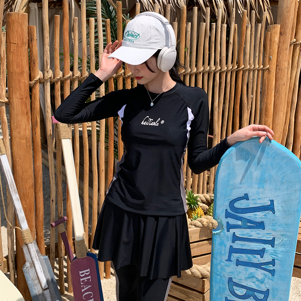 [4피스/무배] 제일리 배색 래쉬가드 체형커버 라인 포인트 긴레깅스 스커트 햇빛차단 수영복