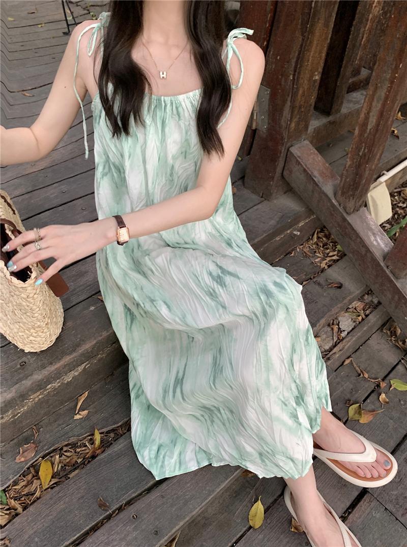 [휴양지원피스🌿] 그린 그라데이션 크링클 리본 끈 나시 롱원피스 그린티/바캉스룩,휴양지룩,동남아여행룩,베트남여행룩,여름원피스,주름원피스,끈나시원피스