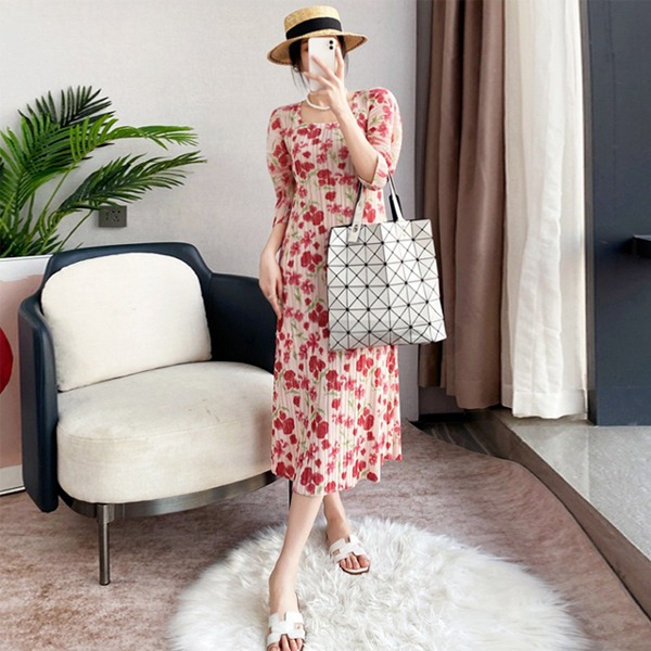 [PLEATS] 유주 스퀘어넥 플라워 7부 플리츠 원피스