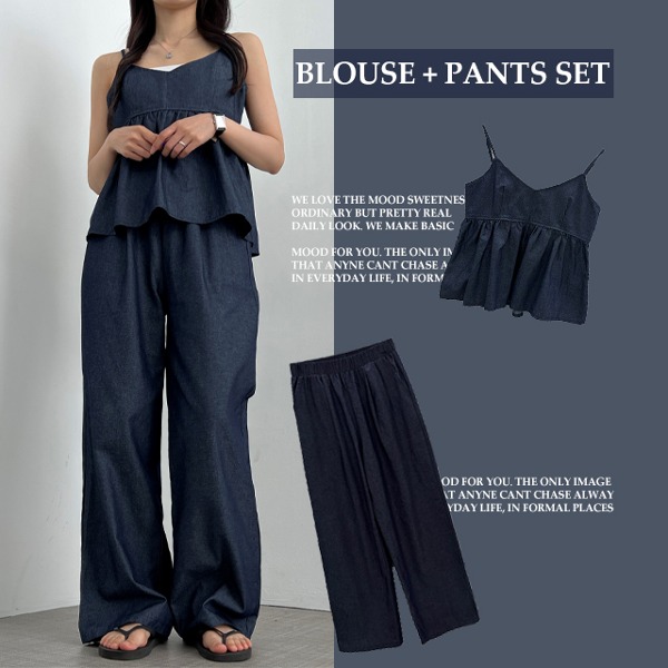 [레이어드/여름셋업] 틴틴 프릴 생지 데님 뷔스티에 블라우스 + 밴딩 와이드 데님팬츠 투피스 세트