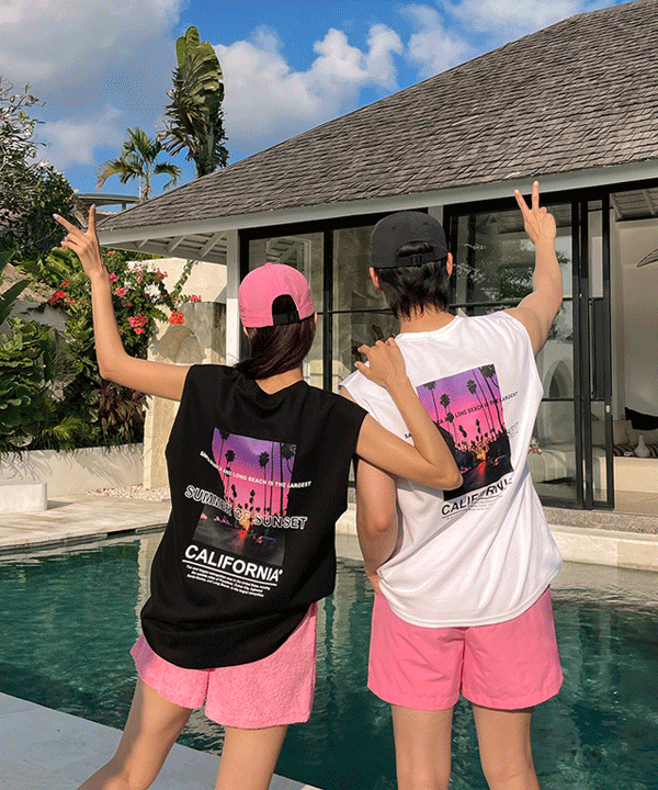 [2장세트]핑크 썬셋 나시 허니문 시밀러 커플룩[휴양지/바캉스/남녀공용/민소매/티셔츠/루즈핏/오버핏/비치웨어] TS20083F