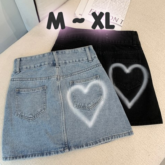 [M-XL/데일리룩] 백 하트 투버튼 플레어 미니 데님 스커트
