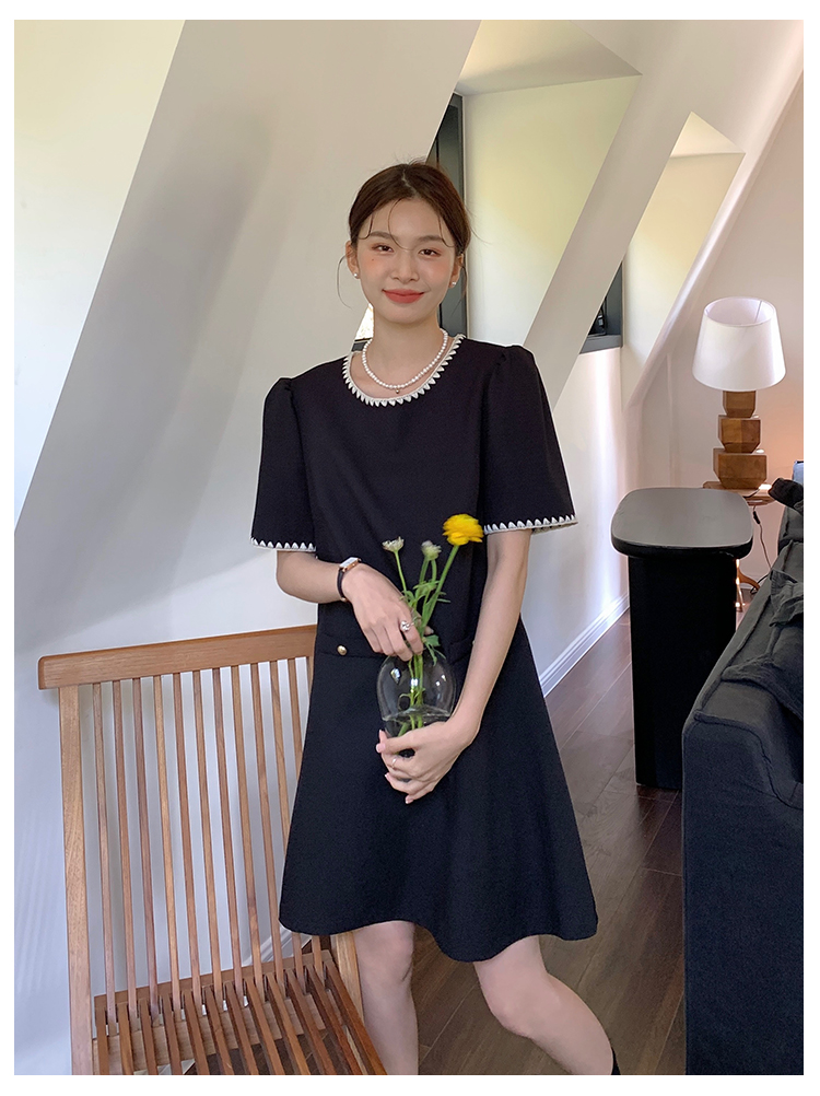 [여름출근룩/하객룩추천💐]심플자수반팔원피스 여름원피스 반팔원피스 A라인 포켓디테일 배색밑단 모임룩 결혼식 하객룩 출근룩 오피스룩 깔끔 플레어 미디원피스