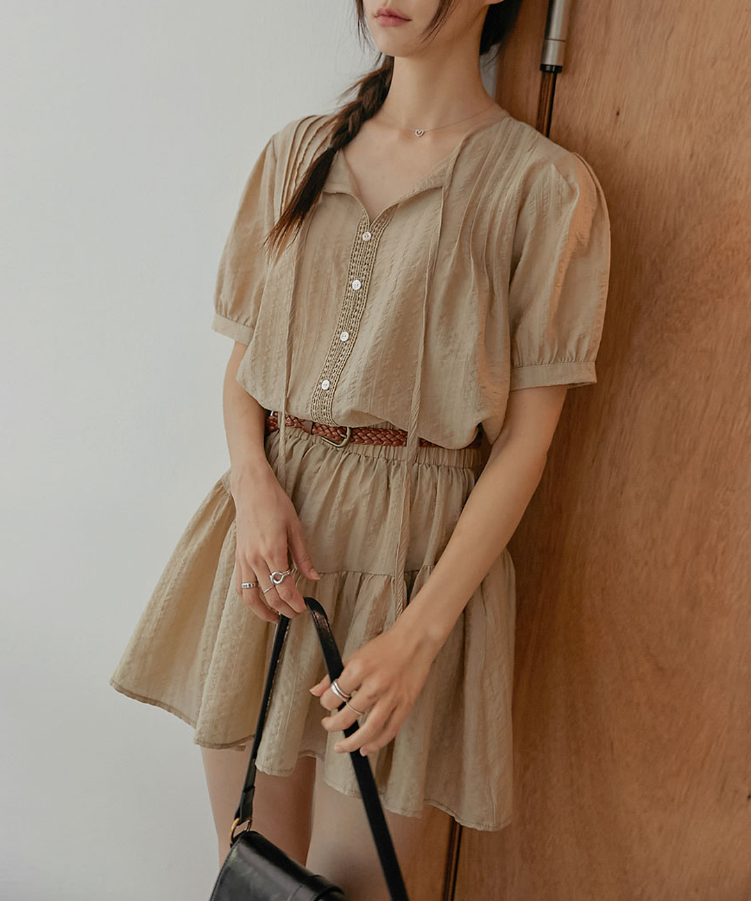 모코 코튼 블라우스 2 피스 벨트 세트 (당일배송/여름/투피스/스커트세트/퍼프소매/자개/리본/매듭/반팔/밴딩/치마바지/레이스/캉캉/동남아/휴가룩)