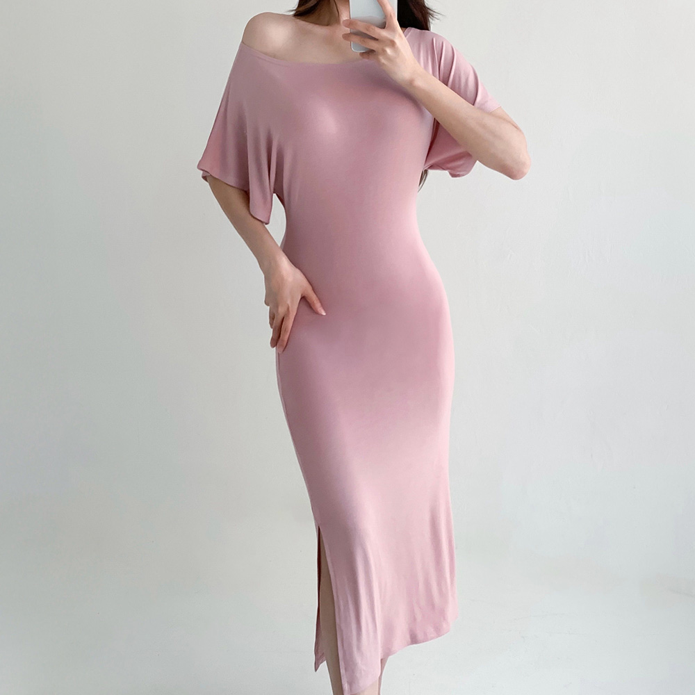 여자 미시룩 오프숄더 스판 머메이드 슬릿 롱원피스