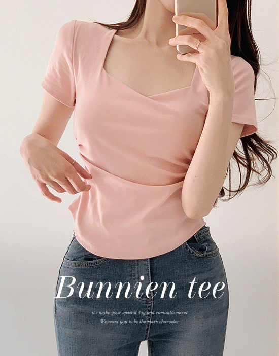 버니엔 하트넥 반팔 티셔츠(셔링/세미크롭/밑단굴림/데일리룩/데이트룩/러블리룩)