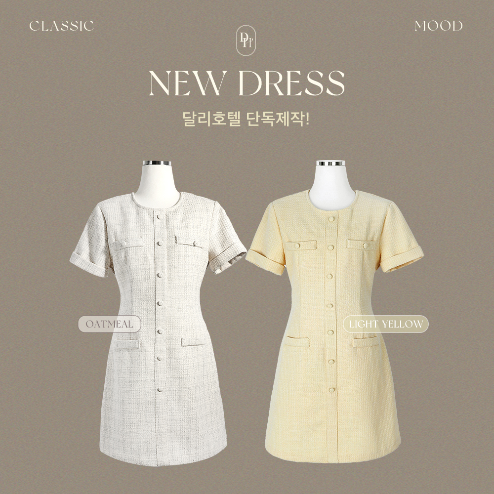 [자체제작/Dali made]클리엔 라운드 버튼 반팔 A라인 트위드 미니 원피스(하객룩/데이트룩)