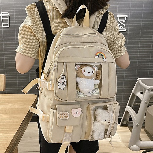 니콜라 나일론 백팩 대학생 책가방 빈티지 캐주얼 캔버스 투명 포켓 버클 지퍼 가방 인형 키링 뱃지 와펜 패치 장식 세트 배낭 데일리 천가방 스쿨백
