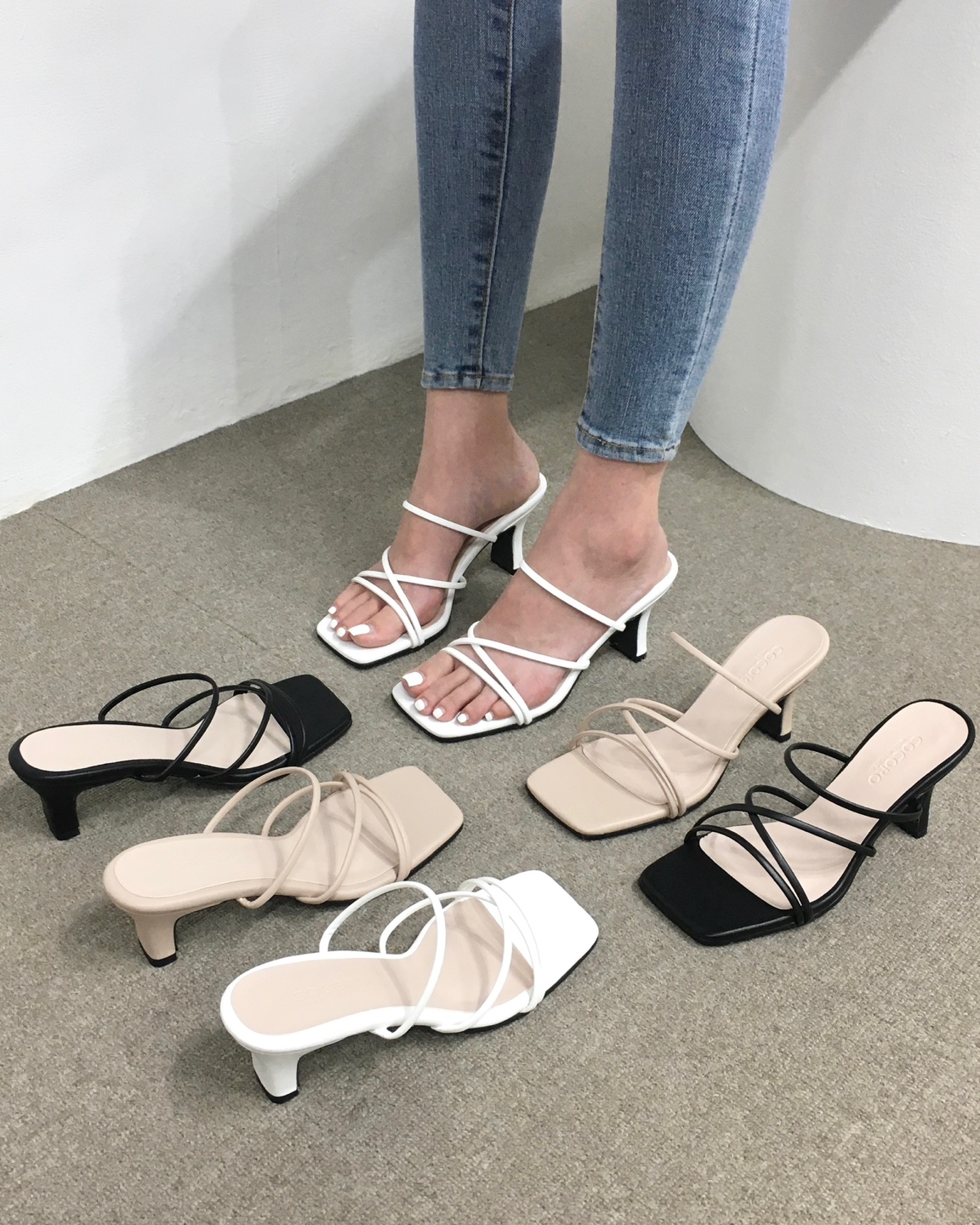[당일배송/국산수제] 5cm,7cm 스퀘어 크로스 스트랩 하프 통굽 슬리퍼 샌들힐