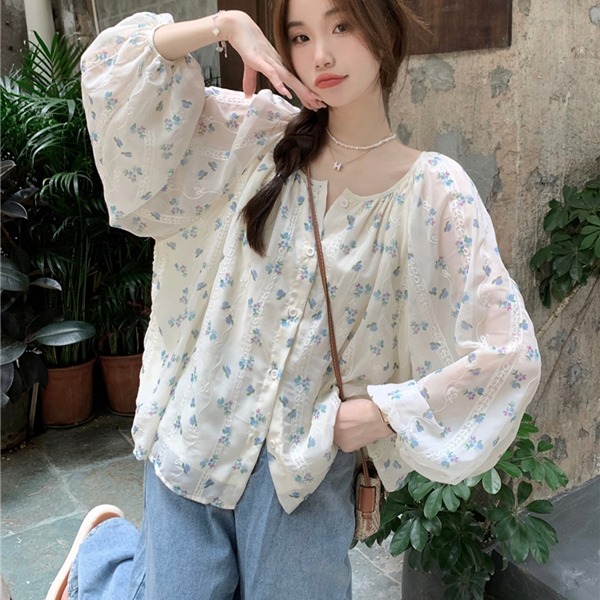 율라니 플라워 라운드 퍼프 긴팔블라우스