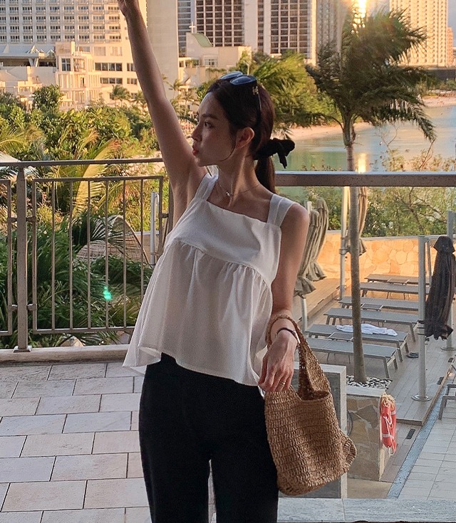 [양면착용✨/휴양지룩으로 딱!!]지아 스퀘어넥 나시 블라우스(6color) [리본 슬리브리스 플레어 휴양지 여행 바캉스 동남아]
