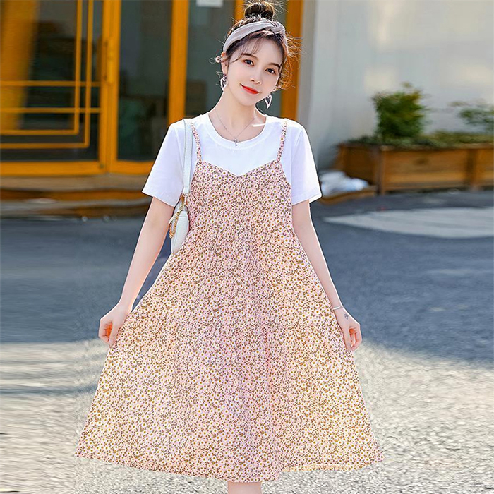 여성 플라워 패턴 반팔 레이어드 원피스 꽃무늬 뷔스티에 민소매 A라인 플레어 스커트
