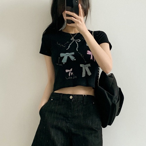 쥬얼리티 - 귀여운 리본 일러스트와 크롭 라인으로 여성스러운 캐쥬얼함이 돋보이는 트랜디한 매력의 반팔 티