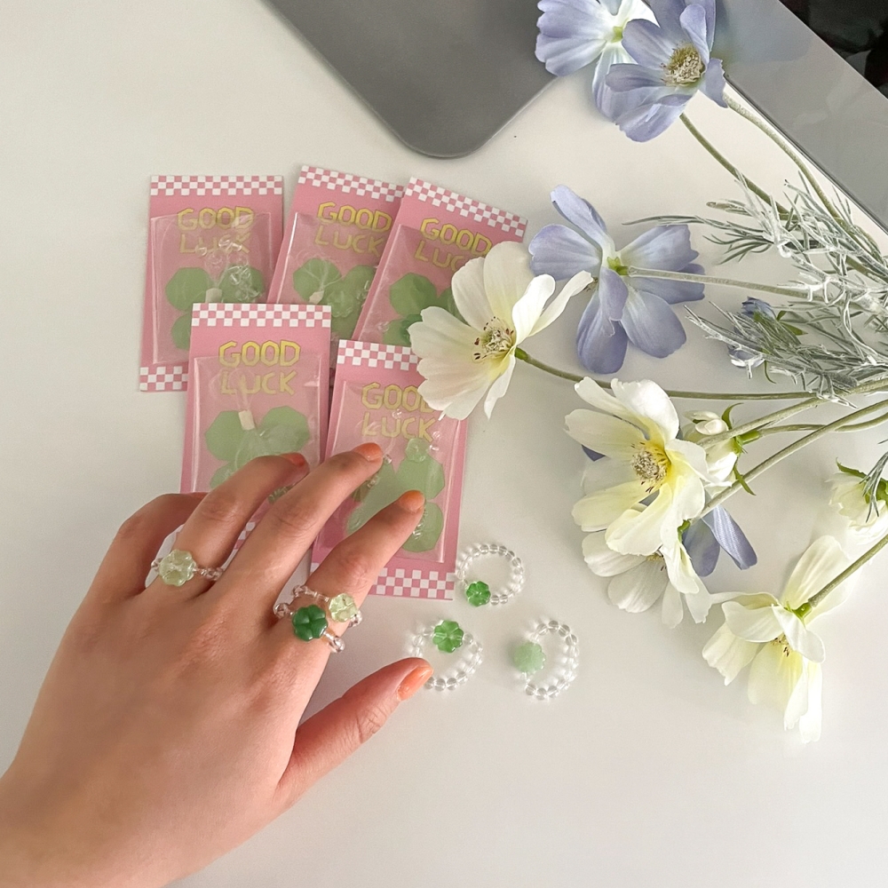 네잎클로버 비즈 반지 만들기 키트 DIY 세트 [6종 클로버 투명 링 심플 여름 포인트 공예 우정 재료]
