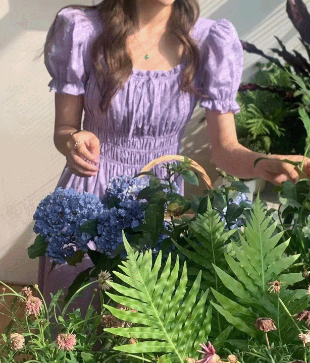 브리니 엠보 스퀘어넥 스모크밴딩 퍼프 롱 원피스