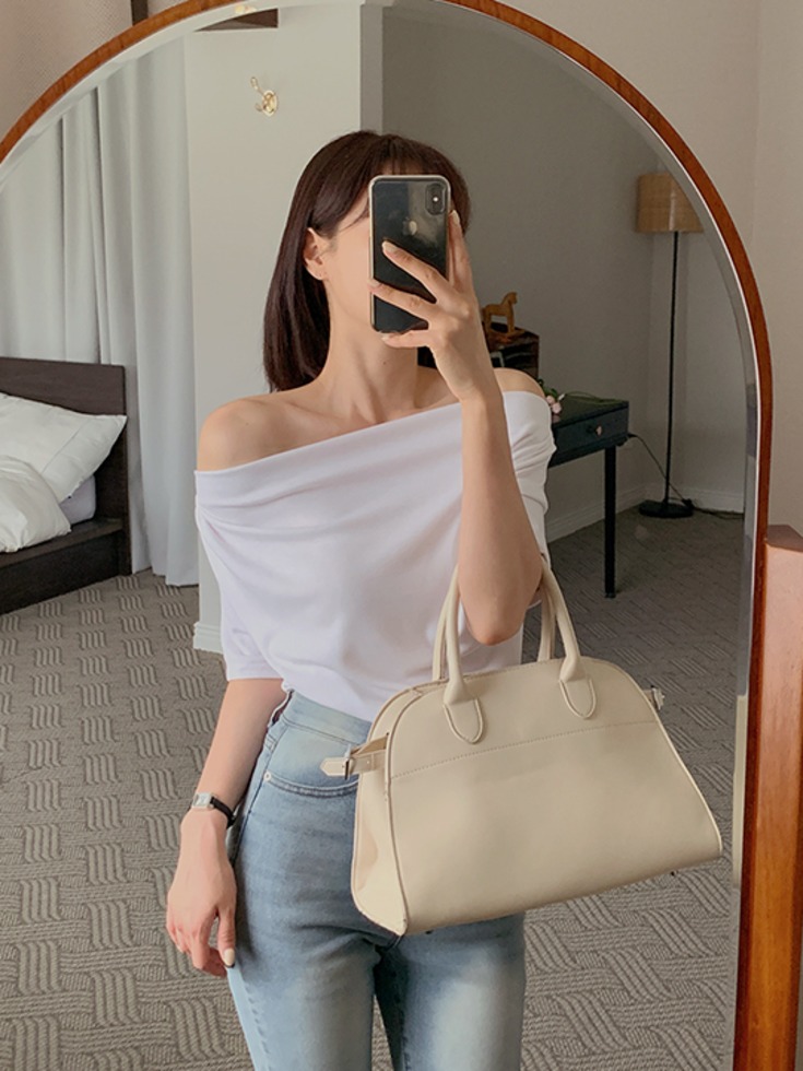[1천장 돌파✨][44-120] 스메잇 스판 핀턱 보트넥 오프숄더 티셔츠 ( 여름-데일리룩-바캉스룩-여행룩-휴양지룩-휴가룩-공항룩-데이트룩-러블리룩-페미닌룩-빅사이즈-120사이즈-자체제작-여리핏-교복템 )