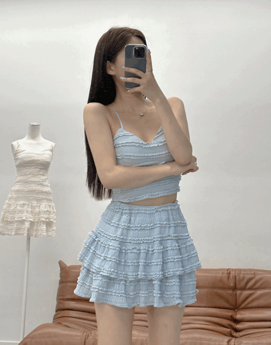 졔졔 크롭 캡내장 나시 캉캉 스커트 투피스 세트 (아이보리/소라/핑크/블랙)
