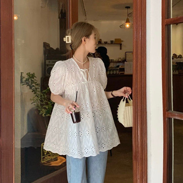 💙당일출고/상체커버/오버핏💙리본 브이넥 펀칭 레이스 자수 퍼프 반팔 미니 원피스 [여름 블라우스 빅사이즈티 나시 레이어드 빈티지 흠뻑쇼 워터밤 휴양지룩 데이트 임부복]5166