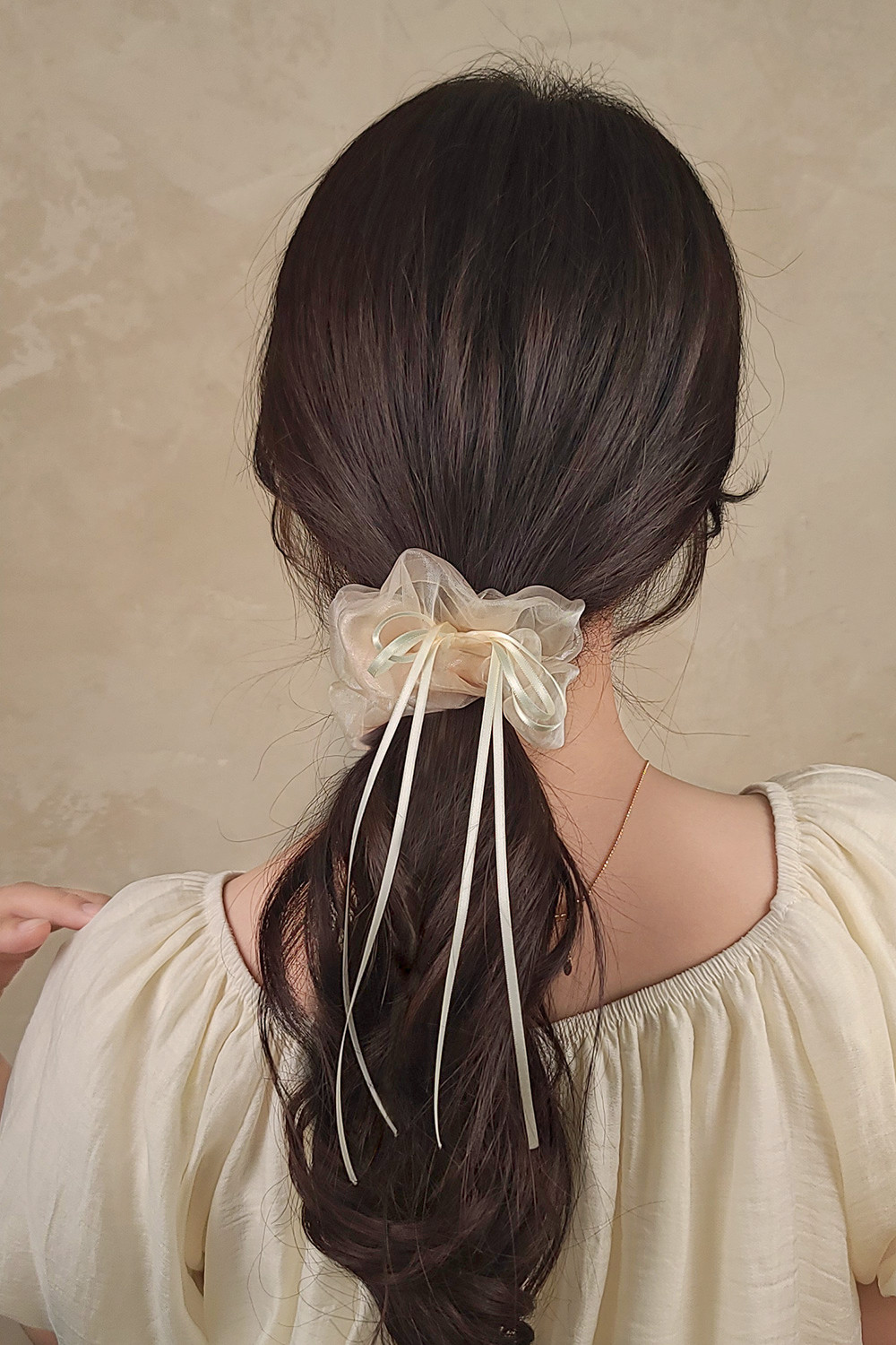 웬들 8컬러 오간자 스크런치 슬림 리본 롱드롭 풍성한 곱창 머리끈